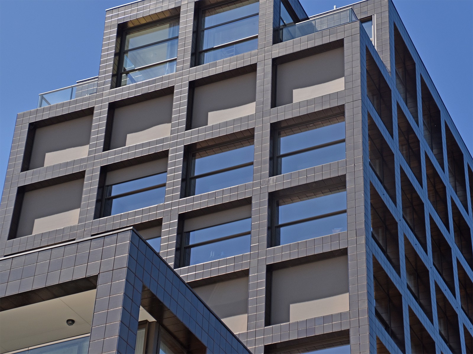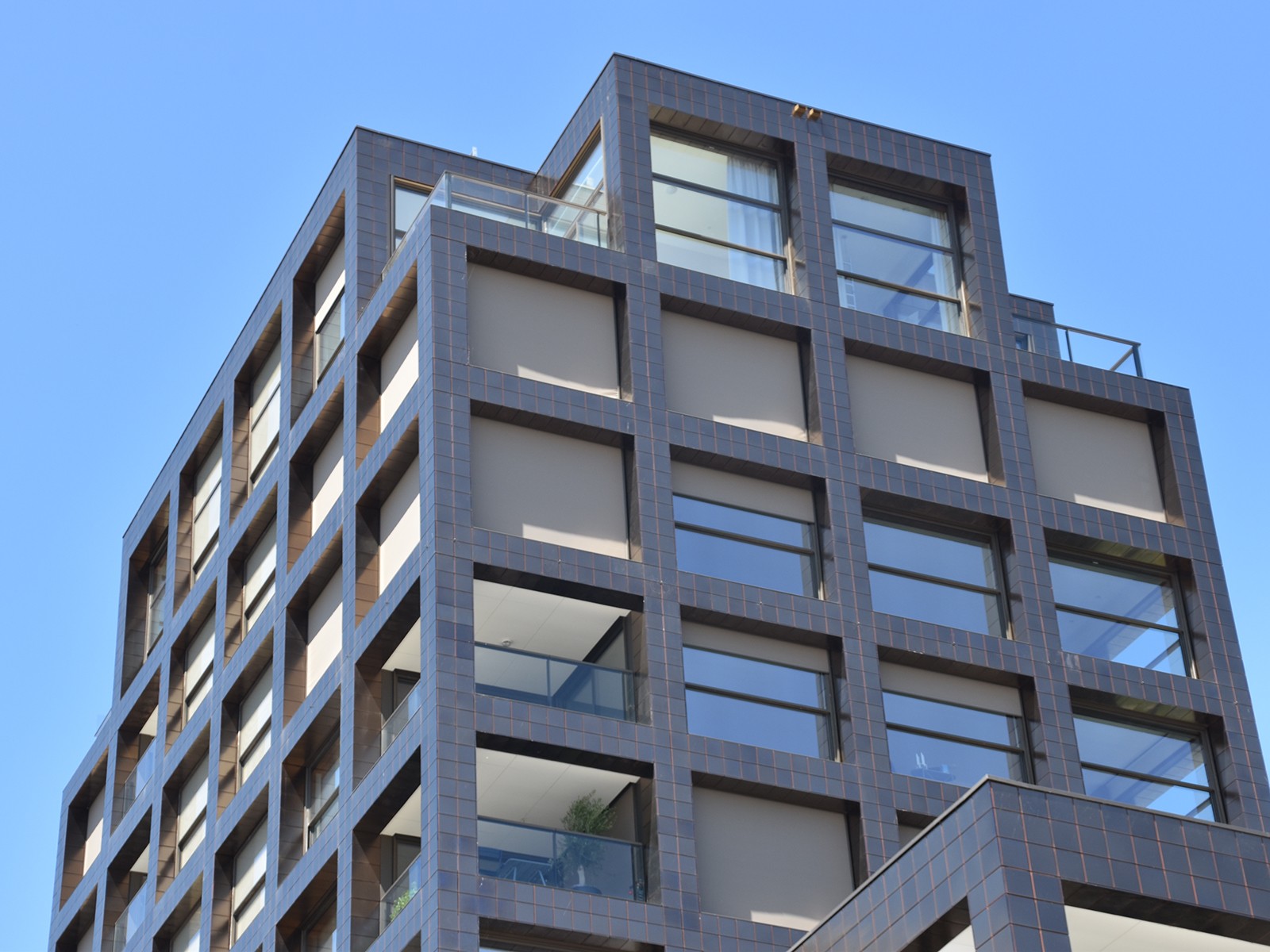 The apartment complex appears to be composed of stacked cubes. The striking exterior is clad in specially developed gold tiles. The tiles pick up the outside light beautifully, from bright yellow-gold during the day to bronze in the evening. 'The colour of the window frames and casing of the SolidScreens are matched to this, this whole thing creates gold-rimmed paintings, so to speak.